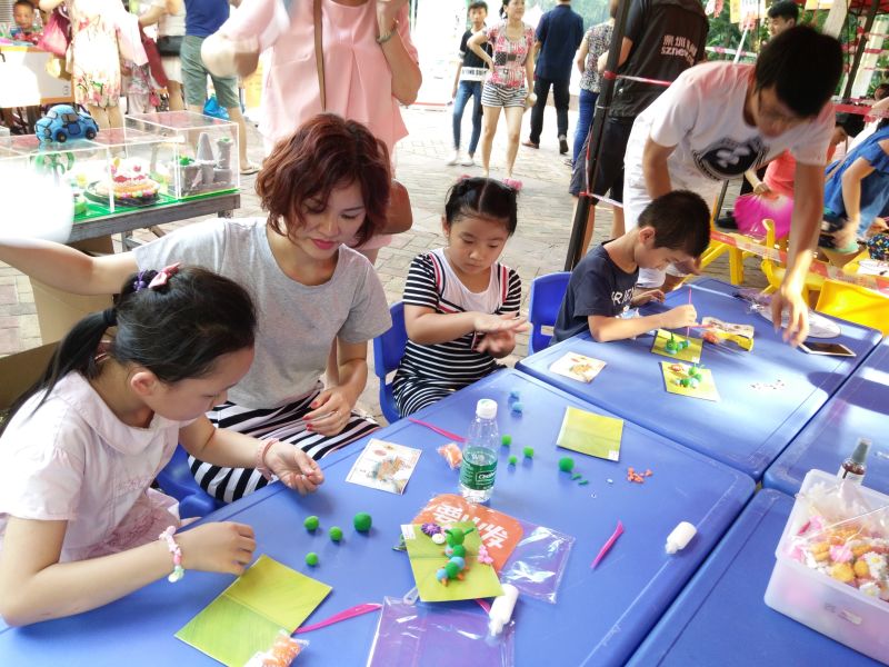 棉花糖、跳房子,讓家長們找回了童年的記憶和樂趣。而動手動腦的扇子彩繪、剪紙、中國結(jié)制作、軟陶制作則讓孩子們體驗(yàn)到手工制作的樂趣。