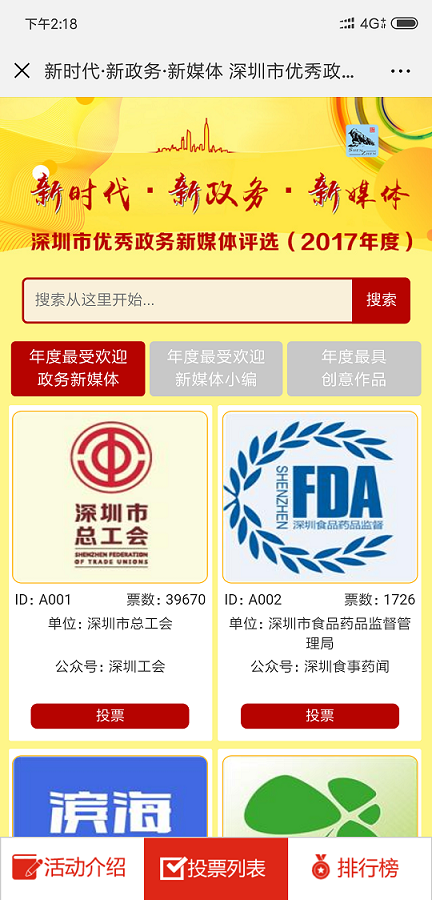 ② 多個(gè)投票活動(dòng)已經(jīng)形成良好群眾效應(yīng),合作方主辦方多屆舉辦,每屆舉辦均由深圳新聞網(wǎng)負(fù)責(zé)投票系統(tǒng)開(kāi)發(fā),例如:健康場(chǎng)所投票、集團(tuán)攝影大賽評(píng)選投票、政務(wù)類投票。形成了良好品牌效應(yīng)和示范,往往一個(gè)區(qū)舉辦的投票活動(dòng)其他區(qū)會(huì)跟進(jìn)舉辦,形成系列投票,例如:“最美護(hù)士”系列投票,“最美醫(yī)生”系列投票,“最美教師”系列投票,“最佳政務(wù)”系列投票等;