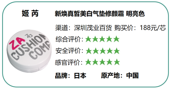 (四)感官評價結(jié)果:姬芮新煥真皙美白氣墊修顏霜和雪花秀采淡致美氣墊粉底液綜合表現(xiàn)最好。