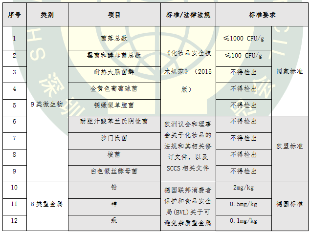 本次比較試驗檢測項目廣泛征求了企業(yè)、業(yè)內(nèi)專家和第三方檢測機(jī)構(gòu)的意見,不僅依據(jù)了現(xiàn)行國家標(biāo)準(zhǔn),而且在國標(biāo)基礎(chǔ)上結(jié)合嚴(yán)格的歐盟標(biāo)準(zhǔn) 《歐盟化妝品法規(guī)EC1223/2009及其相關(guān)修訂文件》、《歐盟消費(fèi)者安全科學(xué)委員會(SCCS)關(guān)于化妝品安全的第九版指南》、德國聯(lián)邦消費(fèi)者保護(hù)和食品安全局(BVL)關(guān)于可避免雜質(zhì)重金屬限值的調(diào)查報告、美國《聯(lián)邦食品、藥品和化妝品法案》、日本厚生勞動省《藥事法》以及其它相關(guān)標(biāo)準(zhǔn)、法規(guī)和技術(shù)文件的要求,采用國家標(biāo)準(zhǔn)檢測方法、實驗室通用方法等手段進(jìn)行檢測,從44項指標(biāo)展開氣墊粉底安全性品質(zhì)大比拼,詳細(xì)項目與要求見表1。