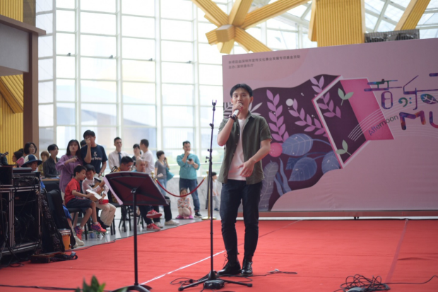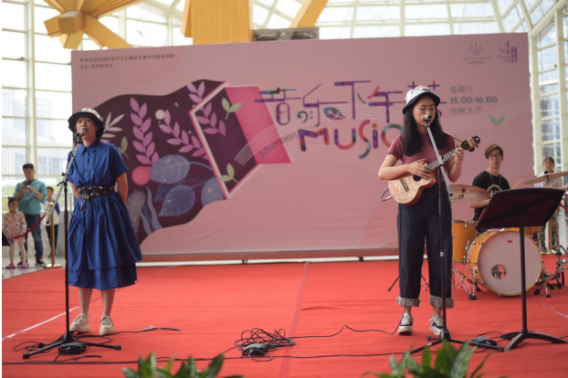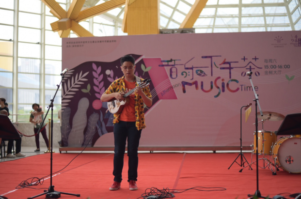 畢業(yè)于深圳大學金鐘音樂學院的主唱周鈺城帶來兩首尤克里里樂隊歌曲, Jason Mraz 的經(jīng)典曲目《 I’ m Yours 》和英國當紅歌星 E d sheeran 的 《 Thinking out Loud 》,周鈺城富有磁性的嗓音,在深圳夏威夷小吉他協(xié)會理事謝佳宜的尤克里里琴聲以及同樣畢業(yè)于深圳大學金鐘音樂學院的鼓手黃曉輝的鼓聲伴奏中,美妙的融合在一起。