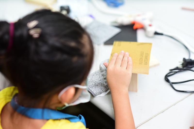 對于“小小木匠”來說,安安靜靜的坐下來,發(fā)揮想象力,傾心打造屬于自己的木質(zhì)音樂盒,無疑是最開心的時刻。聽完老師的講解后,小朋友們迅速進入角色,他們拿著原料木材,一個個化身“小魯班”,用尺子“計較長短”,為它們“改頭換面”起來?;顒蝇F(xiàn)場,一位小朋友正拿著砂紙,小心翼翼的打磨木料,再問及他打磨的工序時,小朋友頗具匠心的告誡記者:“先要用這種粗一點的砂紙打磨,再用這個細的,這樣打磨出來的音樂盒表面就特別光滑啦……”