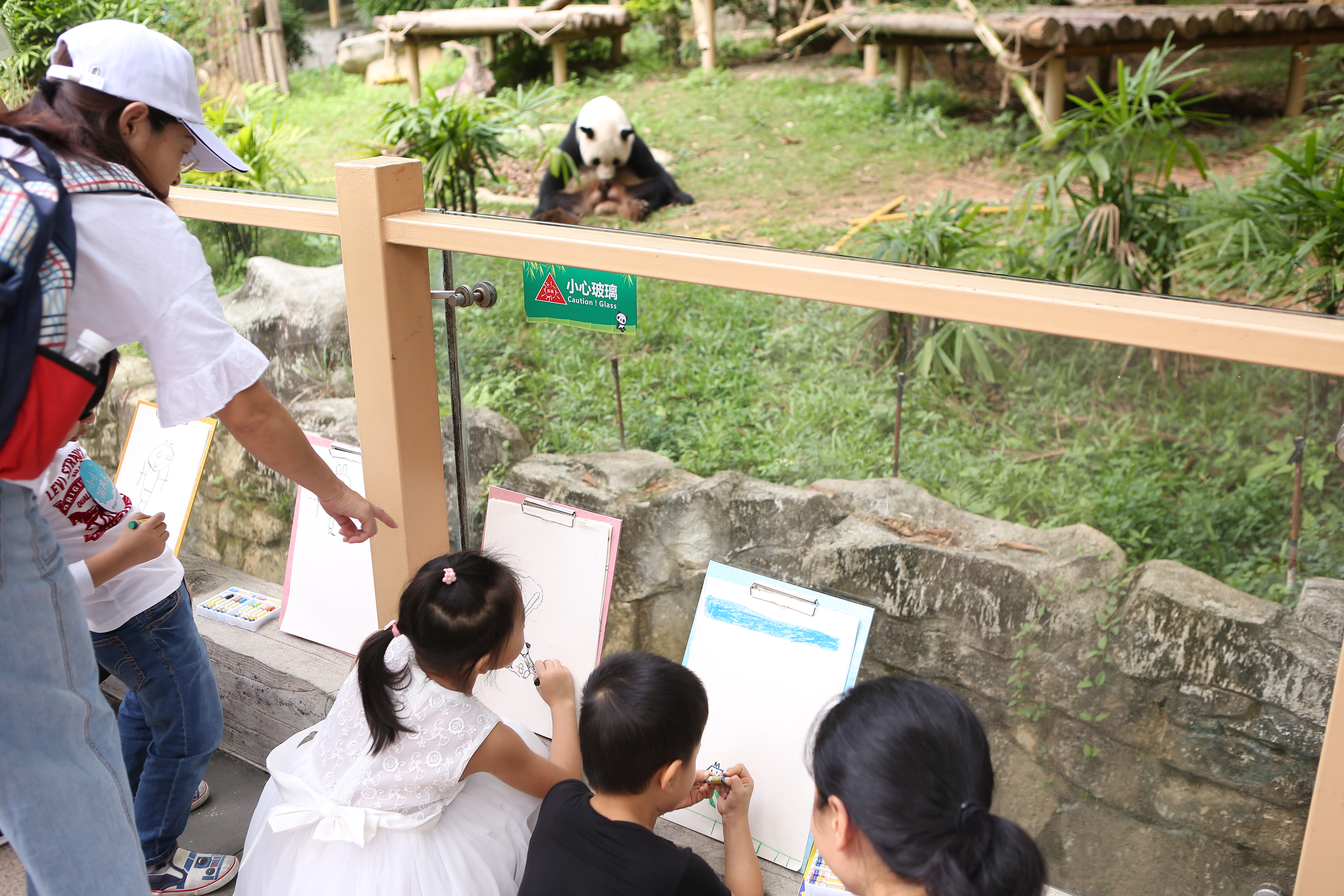 猿猴村的后面,是國(guó)寶大熊貓的家——熊貓莊園。小朋友們來(lái)到這里,瞬間被大熊貓圓滾滾的萌態(tài)所吸引。他們或坐或站,拿起畫(huà)板,完成了從“小飼養(yǎng)員”到“小畫(huà)家”的角色轉(zhuǎn)變。在認(rèn)真觀(guān)察大熊貓后,小朋友們揮動(dòng)手中的畫(huà)筆,將它們的萌態(tài)一一呈現(xiàn)在畫(huà)板上。