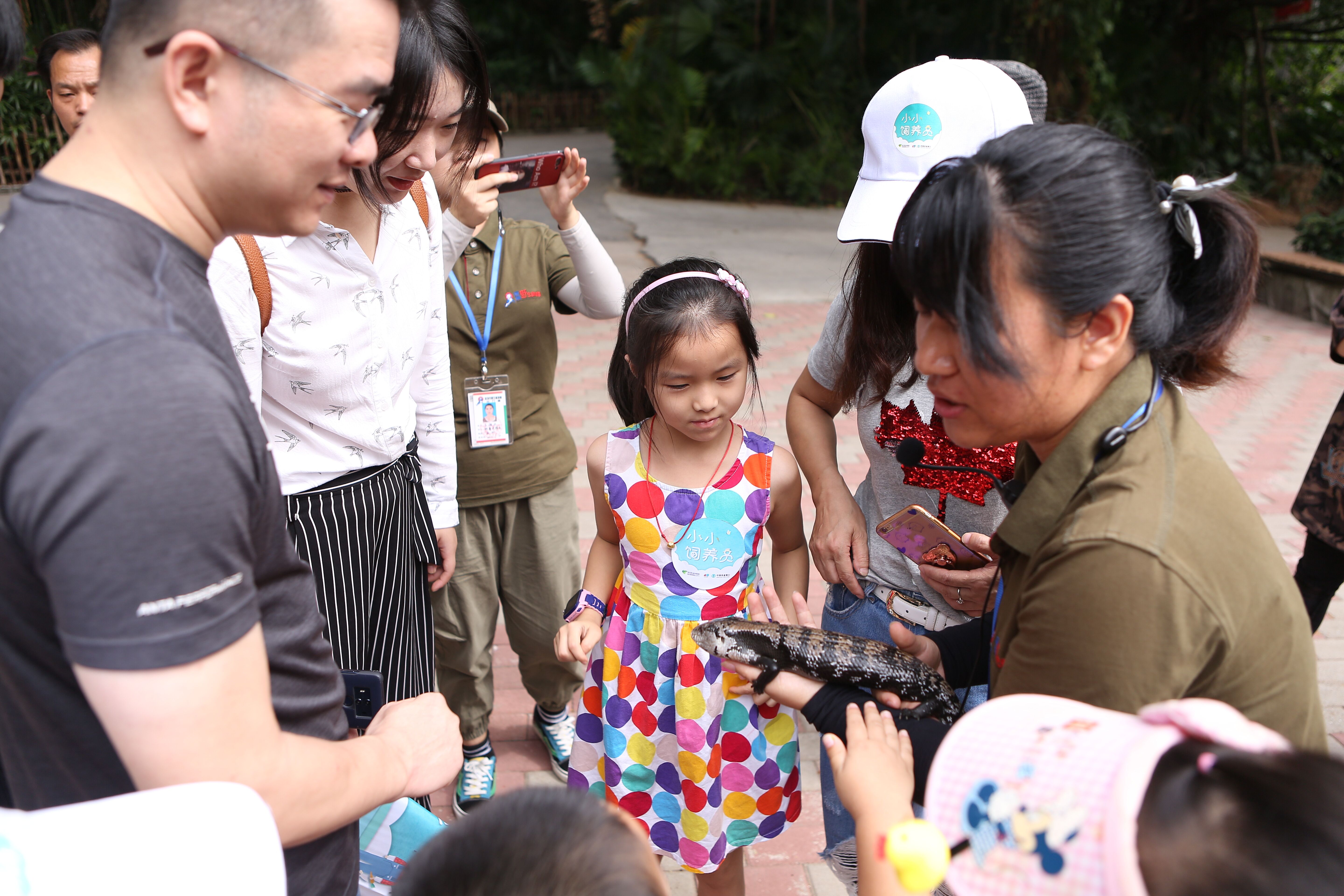 “鬃獅蜥和藍(lán)舌石龍子都是蜥蜴的一種。當(dāng)遭受威脅時(shí),鬃獅蜥會(huì)張開(kāi)嘴及將帶刺的咽喉膨起來(lái)像一頭生氣的獅子。藍(lán)舌石龍子的舌頭是藍(lán)色的,平時(shí)會(huì)不時(shí)向外一伸一伸?!毙∨笥褌冋J(rèn)真地聽(tīng)科普導(dǎo)游講解兩種蜥蜴的區(qū)別,膽大的孩子則抱起蜥蜴仔細(xì)觀(guān)察起來(lái)。