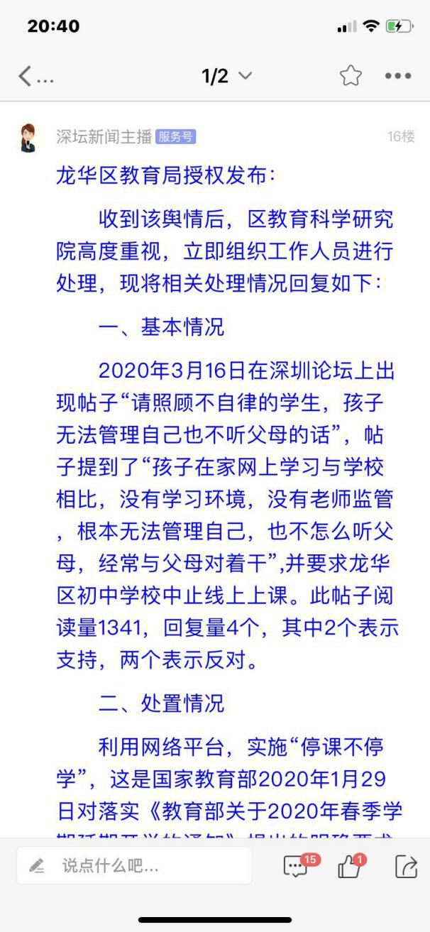 3月16日,有市民在深圳論壇發(fā)帖《請照顧不自律學生,孩子無法管理自己也不聽父母的話》,稱因自己要上班,孩子在家無法自律自覺上網(wǎng)課,學習效率低。上課期間玩游戲,不拿課本出來,看課外書、玩小東西、在電腦上畫畫等等;而老師布置的網(wǎng)上作業(yè),根本不想做,家長反復催后或亂做。自己咨詢過眼科醫(yī)生,表示因為上網(wǎng)課要長時間面對電腦、平板等電子設(shè)備,對孩子眼睛傷害比較大大。特此希望龍華區(qū)教育局可以考慮終止初中的網(wǎng)課。