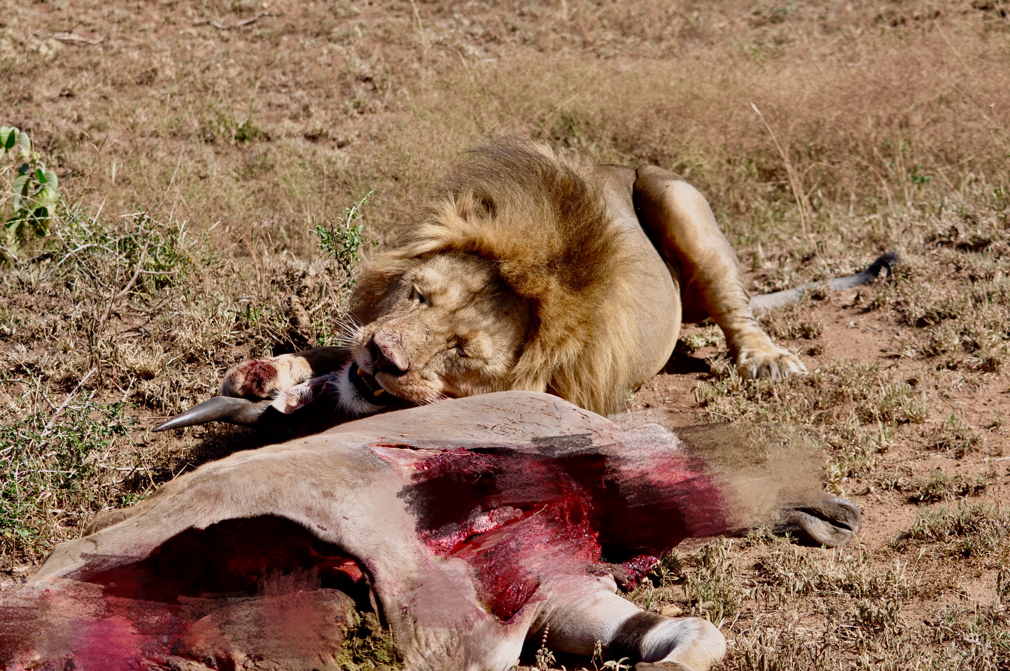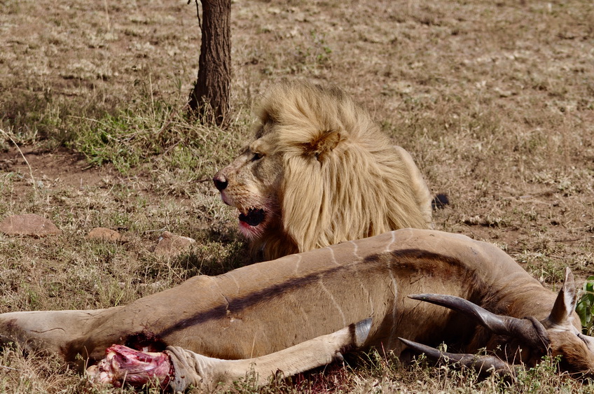 作者運(yùn)氣不錯(cuò),在塞倫蓋蒂巡游時(shí)巧遇一頭雄獅守護(hù)在一頭被咬死的大羚羊旁。李仁奇 攝