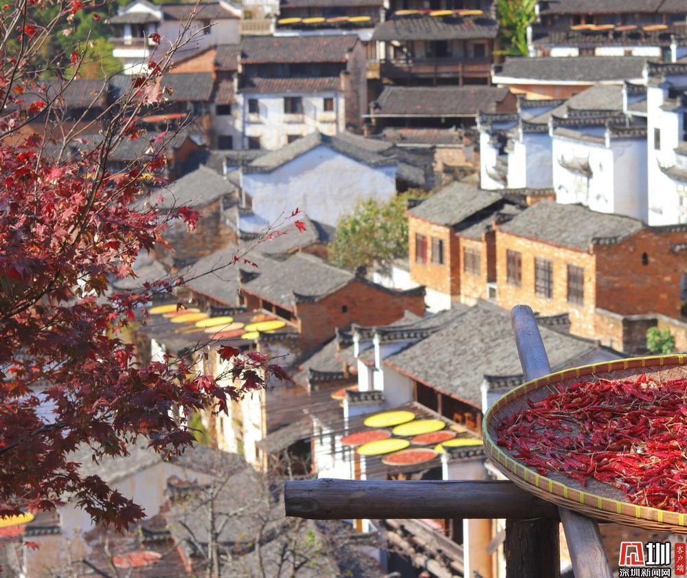 楓葉紅了,村子里靜謐入場,屋頂曬的菊花和辣椒在陽光下,耀眼如常。