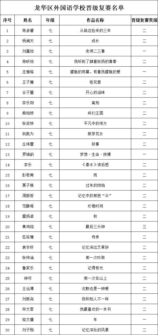 自2021年1月,活動征稿啟動以來,獲得了深圳市廣大中小學(xué)生、教師、文學(xué)愛好者的熱烈響應(yīng)積極參與,吸引了深圳百余所學(xué)校的上萬人關(guān)注報名。現(xiàn)公布龍華區(qū)外國語學(xué)校專場晉級復(fù)賽名單如下: