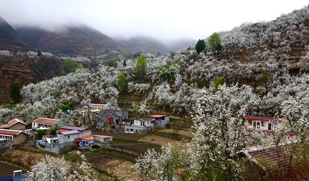 梨花叢中的村寨。李仁奇 攝