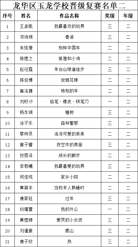 自2021年1月,活動征稿啟動以來,獲得了深圳市廣大中小學(xué)生、教師、文學(xué)愛好者的熱烈響應(yīng)積極參與,吸引了深圳百余所學(xué)校的上萬人關(guān)注報(bào)名?,F(xiàn)公布龍華區(qū)玉龍學(xué)校專場第二批晉級復(fù)賽名單如下: