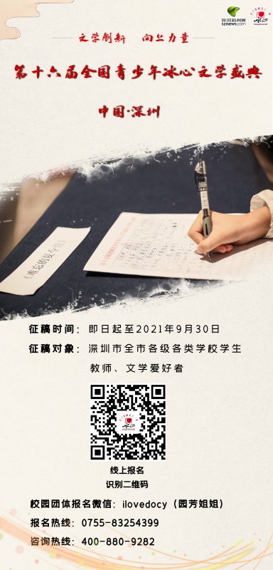 讀特客戶端·深圳新聞網(wǎng)2021年7月6日訊 為繼承和發(fā)揚(yáng)中華文化及冰心文學(xué)精神,促進(jìn)中華文化、中國(guó)現(xiàn)代化文學(xué)史更深入地植入深圳下一代青少年心中,2021年“第十六屆全國(guó)青少年冰心文學(xué)盛典中國(guó)·深圳”正在愛好文學(xué)的師生學(xué)友們之間熱烈展開。