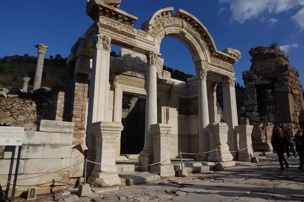 哈德良神廟就在圖書館斜對(duì)面,是典型柯林斯式神廟的代表,內(nèi)墻廊柱上有不同神話人物的雕刻,拱門上有精美的浮雕,前側(cè)拱門上是幸運(yùn)女神的頭像,內(nèi)側(cè)拱門上是張開(kāi)雙臂的蛇發(fā)女妖美杜莎的雕像。李仁奇 攝