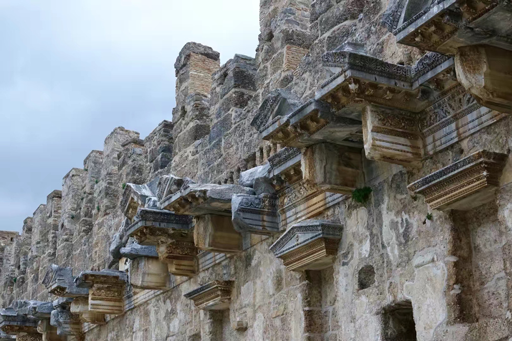 舞臺的墻壁上裝飾著古希臘式樣的圓柱,細節(jié)精美,雕工考究。據(jù)考證,舞臺上方還曾經(jīng)覆蓋著屋頂,可惜已經(jīng)損毀。李仁奇 攝