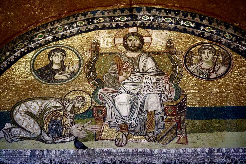 鑲嵌畫《全能的耶穌》。坐在寶座上的耶穌左手握著福音書,上面用希臘文寫著:“賜予汝和平,我世界之光”。耶穌左邊是圣母瑪利亞,右邊是大天使,當時的羅馬皇帝虔誠的匍匐在耶穌面前。李仁奇 攝