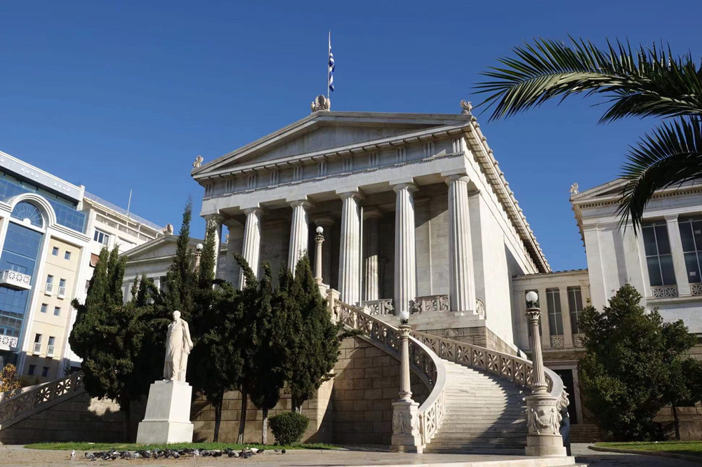 雅典在希臘獨立之后建了許多優(yōu)雅的新古典主義建筑,其中最著名的國家圖書館、國家科學院和雅典大學被稱為新古典主義三部曲,這三座建筑連在一起,蔚為壯觀,是這座城市的地標。李仁奇 攝