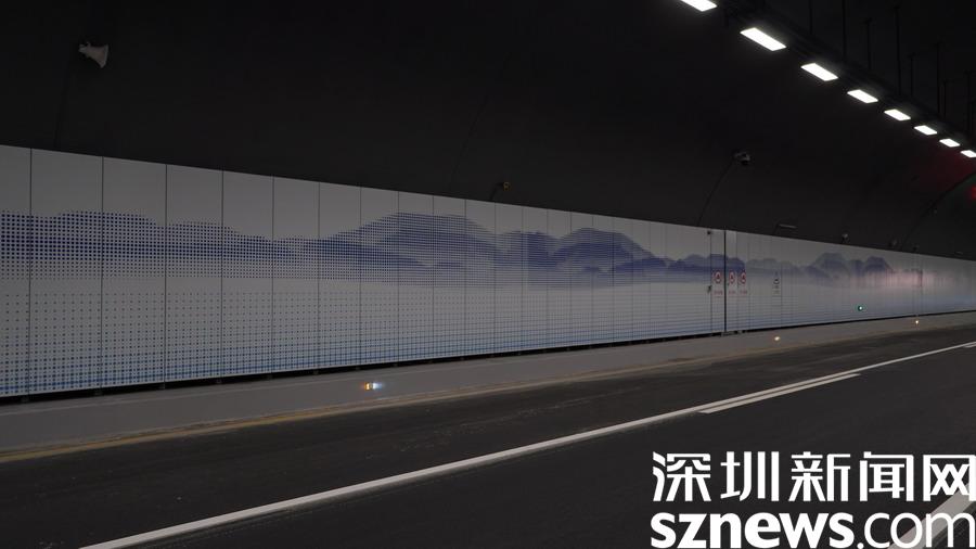 到達(dá)隧道的中段部分,映入記者眼簾的是一道道彩色的燈帶,這些燈帶可以根據(jù)環(huán)境光變換成七種不同的顏色,可謂科技感十足。在即將駛出隧道口200米處,我們能看采用彩色絲印搪瓷鋼板呈現(xiàn)的坪山地貌風(fēng)光、鹽田山海風(fēng)光,這意味著,我們穿過(guò)了馬巒山的山體,一下子從坪山來(lái)到了鹽田區(qū)范圍內(nèi)的惠深沿海高速,這趟坪山到鹽田的隧道之旅僅僅不到10分鐘就要結(jié)束了。