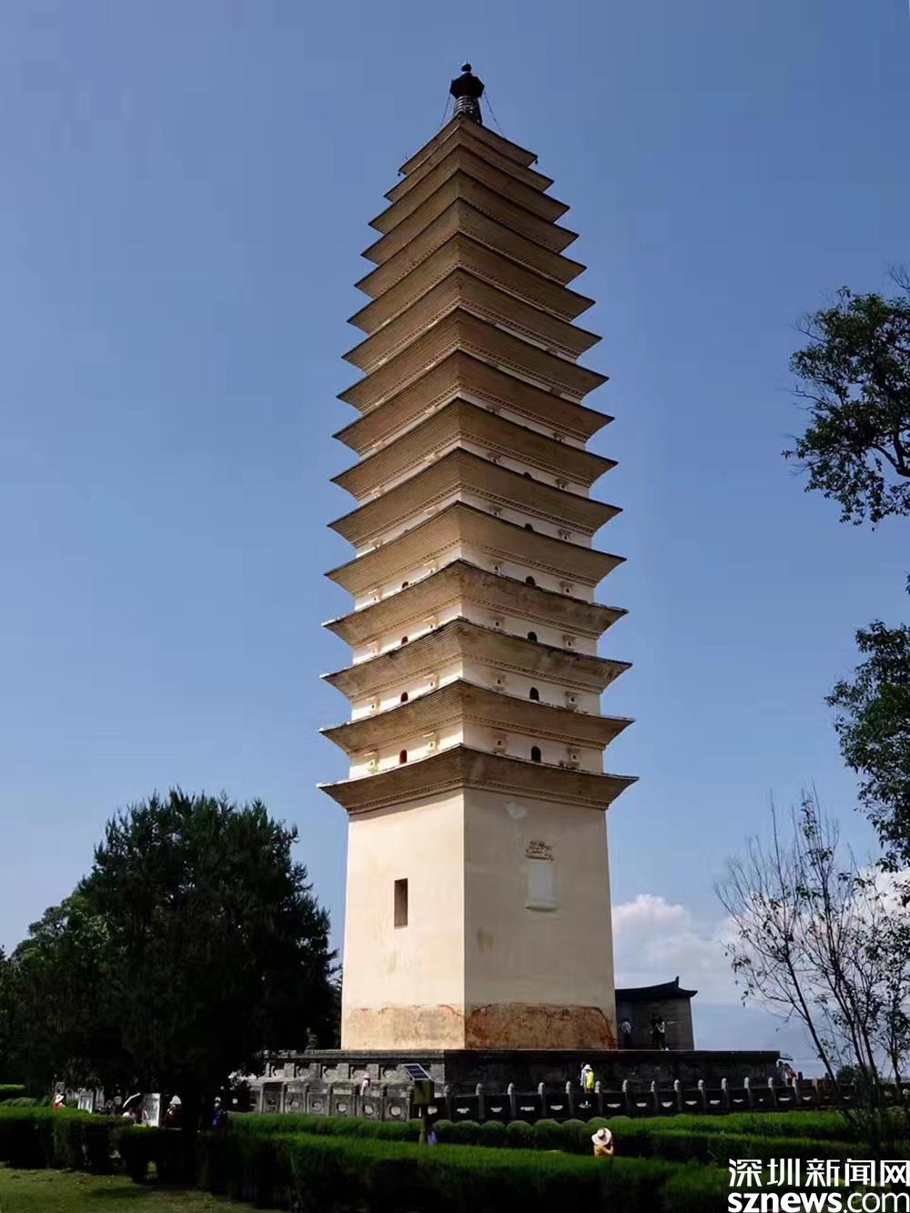 大塔名千尋塔,通高69.13米,底方9.9米,凡16級。南北小塔均為十級,高42.17米,為八角形密檐式空心磚塔。李仁奇 攝