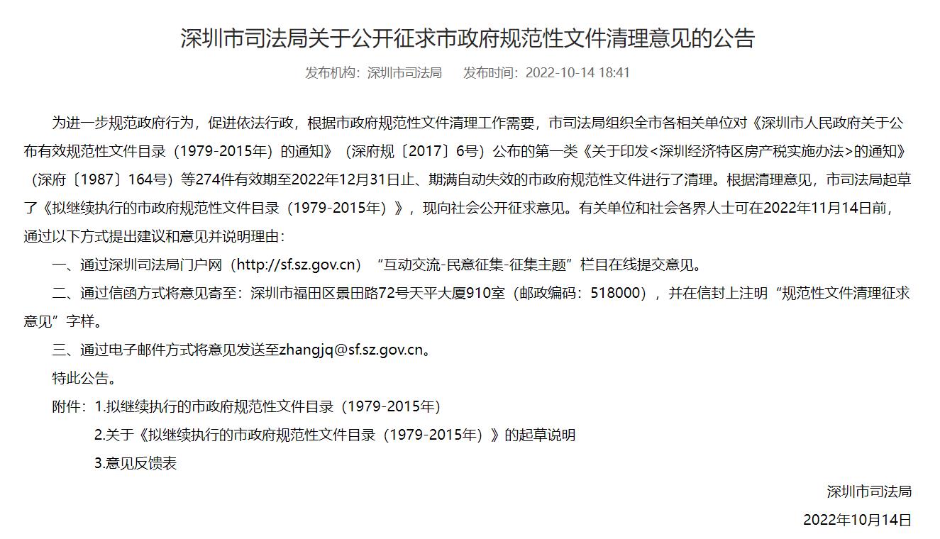讀特客戶端·深圳新聞網(wǎng)2022年10月20日訊(記者 翁任瑩)近日,深圳市司法局就《擬繼續(xù)執(zhí)行的市政府規(guī)范性文件目錄(1979-2015年)》向社會(huì)公開征求意見,擬對(duì)274件有效期至2022年12月31日止、期滿自動(dòng)失效的市政府規(guī)范性文件進(jìn)行清理。