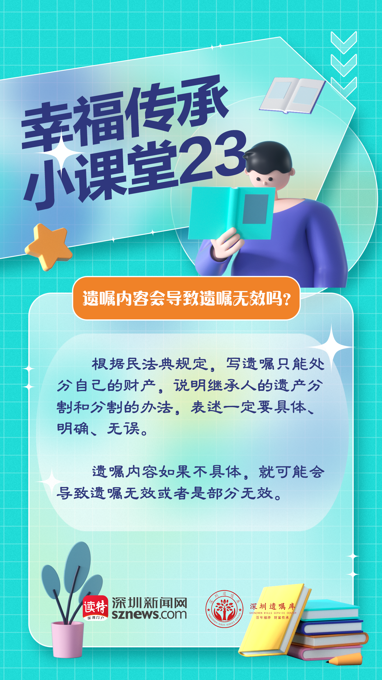 今天,由深圳遺囑庫(kù)與深圳新聞網(wǎng)聯(lián)合制作的幸福傳承小課堂第23期,我們就來(lái)說(shuō)說(shuō),遺囑什么情況下可能無(wú)效。根據(jù)民法典規(guī)定,寫(xiě)遺囑只能處分自己的財(cái)產(chǎn),說(shuō)明繼承人的遺產(chǎn)分割和分割的辦法,表述一定要具體、明確、無(wú)誤。遺囑內(nèi)容如果不具體,就可能會(huì)導(dǎo)致遺囑無(wú)效或者是部分無(wú)效。因此,李大爺不能將財(cái)產(chǎn)的全部都給到后老伴,法院也判定了這份遺囑是部分無(wú)效的。