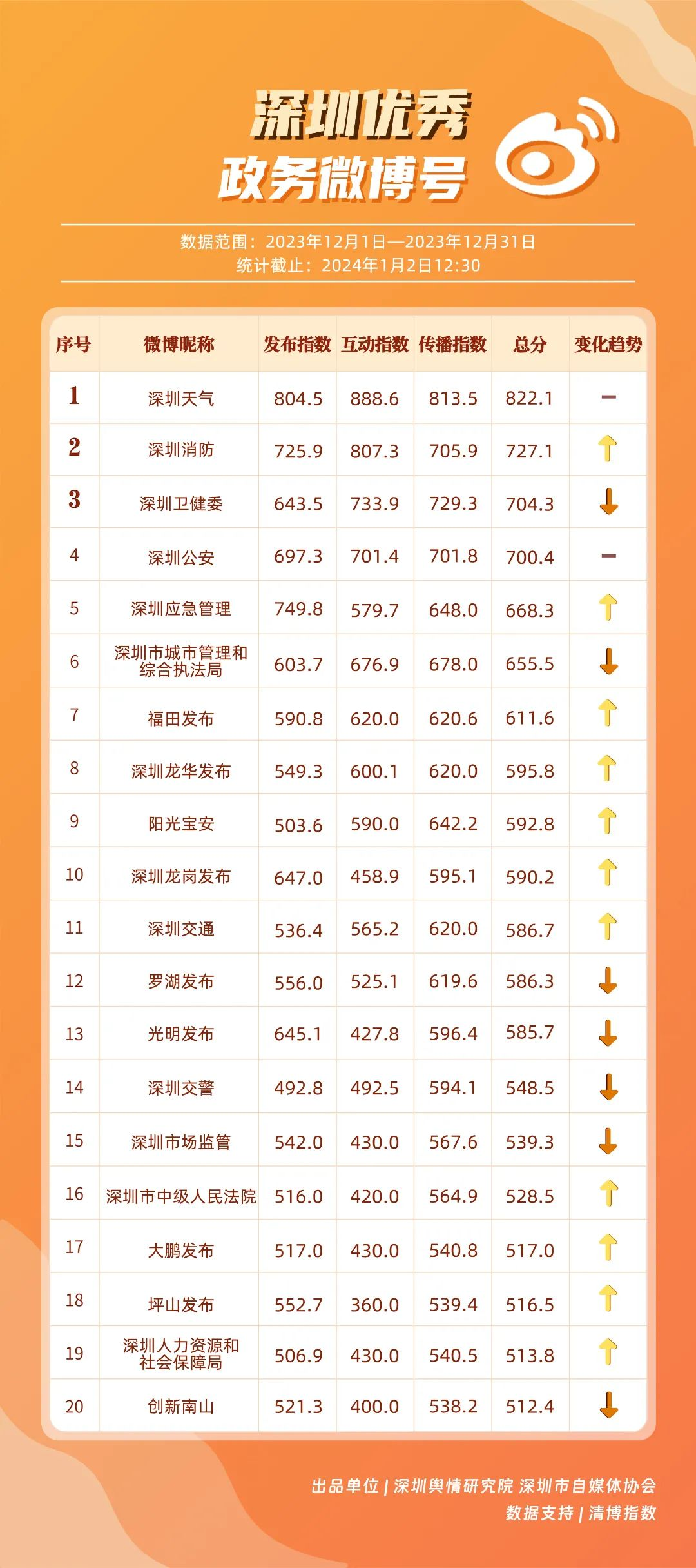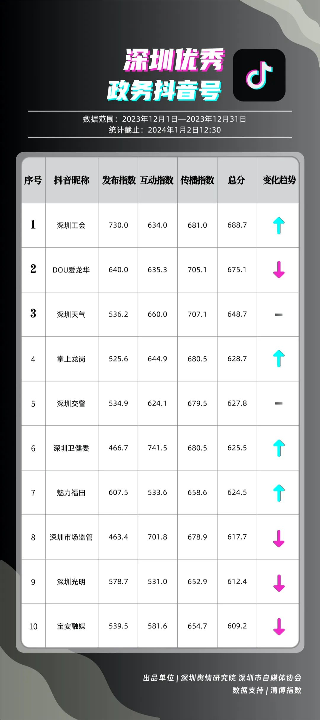 深圳新聞網(wǎng)1月16日訊(記者 陳曉君 實習生 張馳)2024年1月15日,《深圳優(yōu)秀政務(wù)新媒體矩陣》(2023年12月期)正式發(fā)布,共有10個新媒體矩陣被評為“優(yōu)秀”,分別是市氣象局、市衛(wèi)生健康委、龍崗區(qū)、福田區(qū)、龍華區(qū)、光明區(qū)、市應急管理局、寶安區(qū)、羅湖區(qū)、市市場監(jiān)督管理局。上述優(yōu)秀矩陣在內(nèi)容質(zhì)量、更新頻率、粉絲互動等方面穩(wěn)定性較高,獲得公眾的關(guān)注與支持。