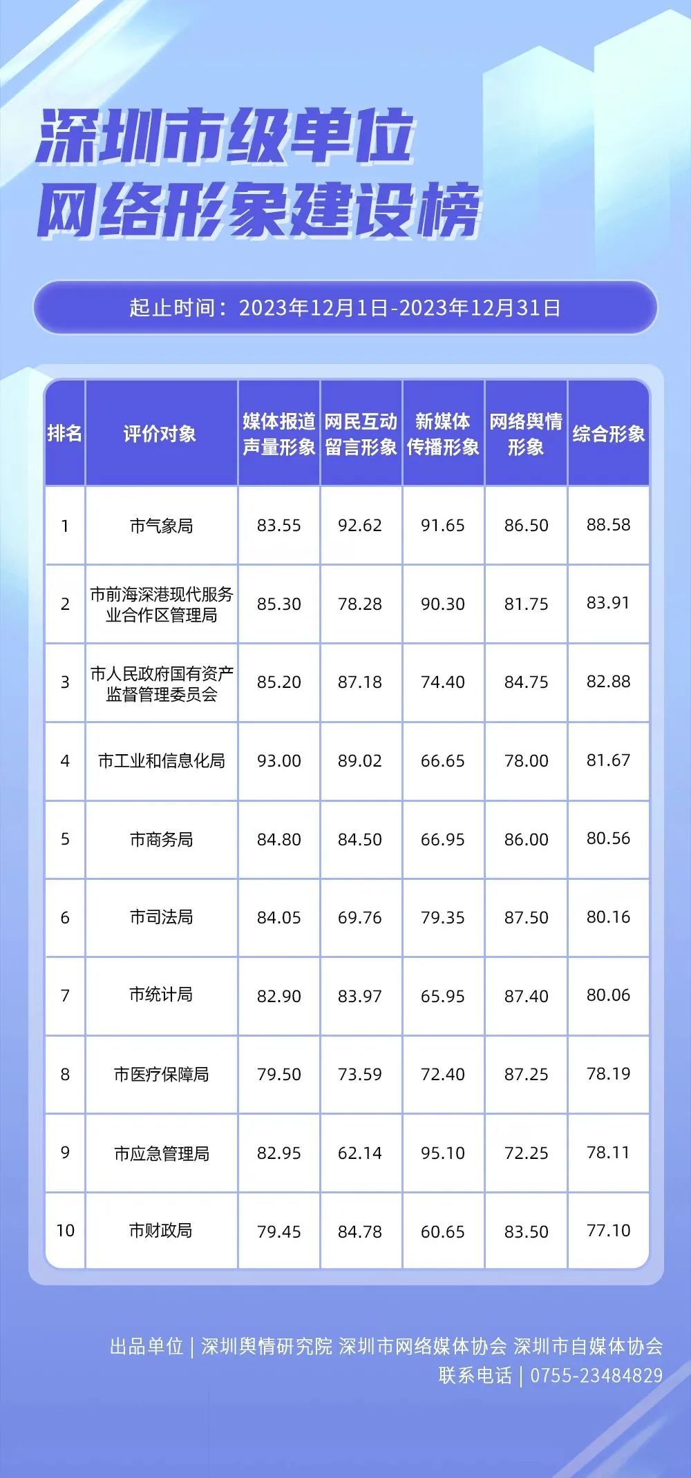 在《深圳市級單位網(wǎng)絡形象建設榜》中,市氣象局、市前海深港現(xiàn)代服務業(yè)合作區(qū)管理局、市人民政府國有資產(chǎn)監(jiān)督管理委員會、市工業(yè)和信息化局、市商務局、市司法局、市統(tǒng)計局、市醫(yī)療保障局、市應急管理局、市財政局依次上榜。榜單顯示,有超半數(shù)單位綜合形象得分在80分以上。其中,有3個單位新媒體傳播形象得分在95分以上;5個單位網(wǎng)絡輿情形象得分在85分以上,另有多個單位媒體報道聲量形象、網(wǎng)民互動留言聲量形象得分在80分以上,展現(xiàn)出上榜單位綜合實力較強、單項優(yōu)勢突出的特點。