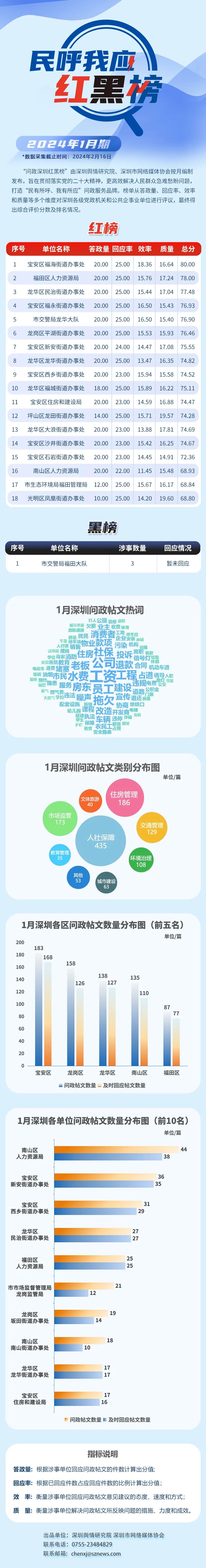 深圳新聞網(wǎng)3月2日訊(記者 陳曉君 實(shí)習(xí)生 蔡曉婷)2024年2月27日,深圳輿情研究院、深圳市網(wǎng)絡(luò)媒體協(xié)會編制推出1月期“深圳民呼我應(yīng)紅黑榜”,以表彰高質(zhì)效解決民生訴求的單位,提醒答政履職主動性較弱的單位。本期共計19家單位登榜,包括紅榜單位18家,黑榜單位1家。較上期榜單,紅榜單位數(shù)量增加,黑榜單位數(shù)量持平。