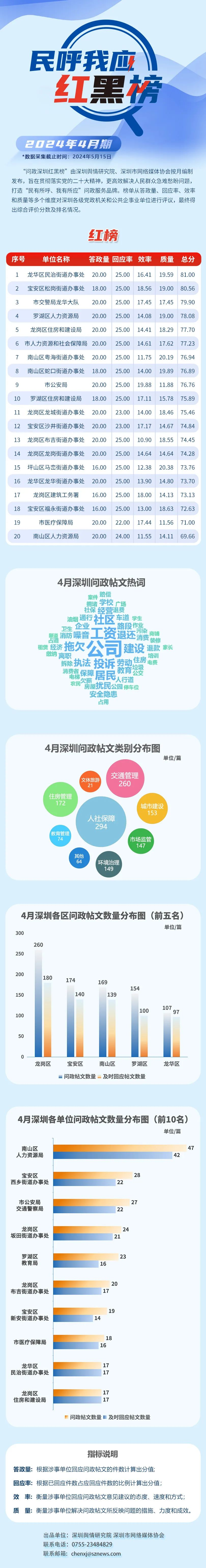 “深圳民呼我應(yīng)紅黑榜”由深圳輿情研究院、深圳市網(wǎng)絡(luò)媒體協(xié)會(huì)按月編制發(fā)布,旨在貫徹落實(shí)黨的二十大精神,更高效解決人民群眾急難愁盼問(wèn)題,打造“民有所呼、我有所應(yīng)”問(wèn)政服務(wù)品牌。榜單從答政量、回應(yīng)率、效率和質(zhì)量等多個(gè)維度對(duì)深圳各級(jí)黨政機(jī)關(guān)和公共企事業(yè)單位進(jìn)行評(píng)議,最終得出綜合評(píng)價(jià)分?jǐn)?shù)及排名情況。