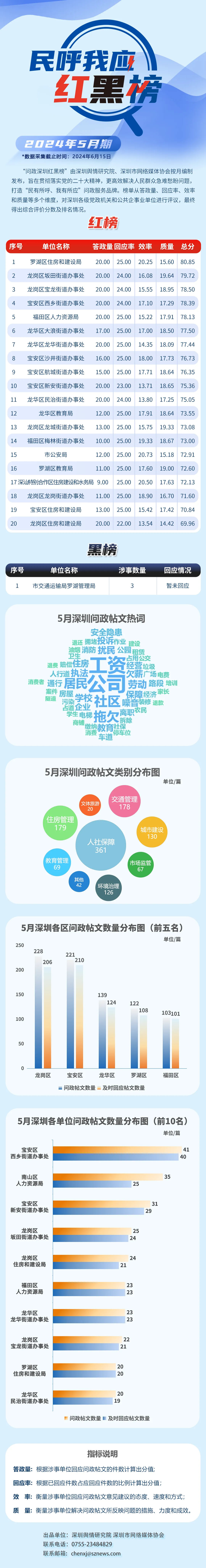 2024年5月,共有20家單位因積極解決民生問題,認(rèn)真細(xì)致答政,登上“紅榜”,它們分別是:羅湖區(qū)住房和建設(shè)局、龍崗區(qū)坂田街道辦事處、龍崗區(qū)寶龍街道辦事處、寶安區(qū)西鄉(xiāng)街道辦事處、福田區(qū)人力資源局、龍華區(qū)大浪街道辦事處、龍華區(qū)龍華街道辦事處、寶安區(qū)沙井街道辦事處、寶安區(qū)航城街道辦事處、寶安區(qū)新安街道辦事處、龍華區(qū)民治街道辦事處、龍華區(qū)教育局、龍崗區(qū)龍城街道辦事處、福田區(qū)梅林街道辦事處、市公安局、羅湖區(qū)教育局、深汕特別合作區(qū)住房建設(shè)和水務(wù)局、龍崗區(qū)龍崗街道辦事處、寶安區(qū)住房和建設(shè)局、龍崗區(qū)住房和建設(shè)局。另外,市交通運(yùn)輸局羅湖管理局因相關(guān)帖文回應(yīng)率偏低,整體答政效果不佳,被列入“黑榜”。