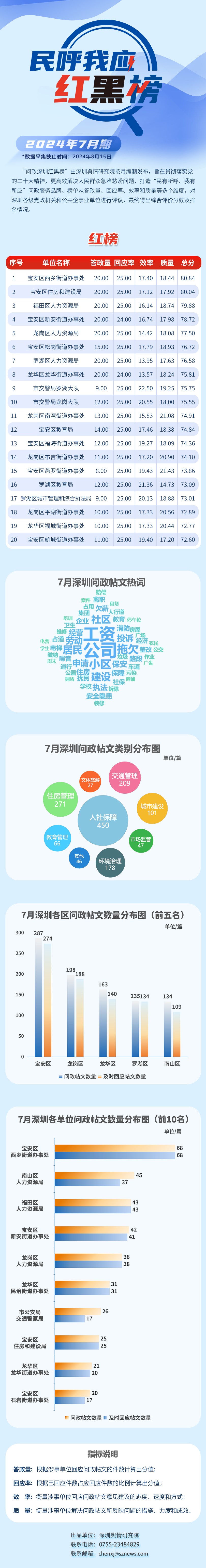 本期榜單采集的帖文主要來自深圳市及各區(qū)政府官網(wǎng)、深圳論壇、人民網(wǎng)領(lǐng)導(dǎo)留言板、深圳新聞網(wǎng)“民呼我應(yīng)”等平臺,所采集帖文發(fā)布時(shí)間為2024年7月1日至7月31日,采集截止時(shí)間為2024年8月15日。