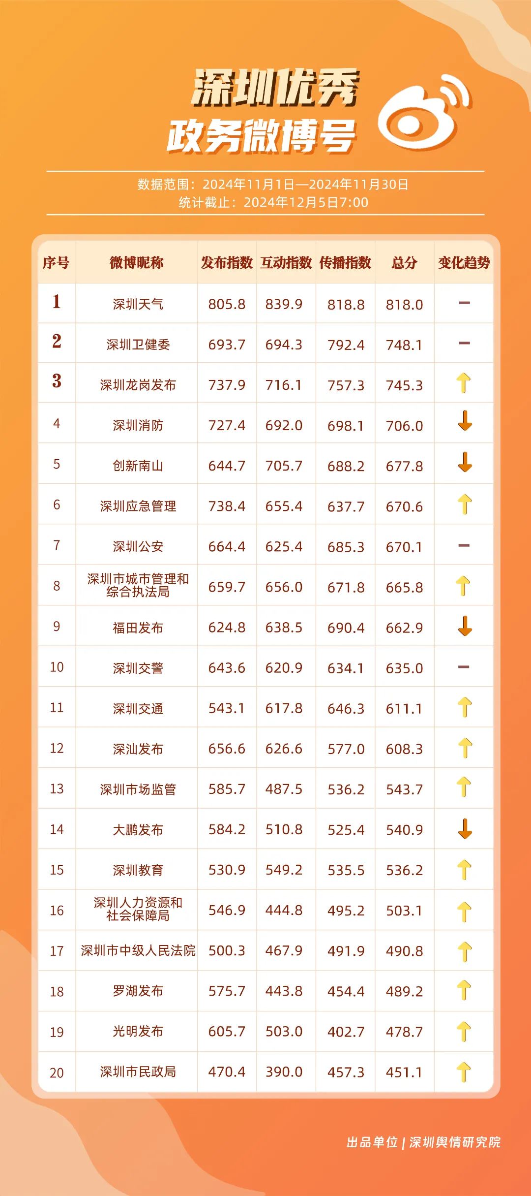 11月,“深圳天氣”“深圳衛(wèi)健委”“深圳龍崗發(fā)布”“深圳消防”“創(chuàng)新南山”“深圳應(yīng)急管理”“深圳公安”“深圳市城市管理和綜合執(zhí)法局”“福田發(fā)布”“深圳交警”等20個賬號入選“優(yōu)秀政務(wù)微博號”。“深圳天氣”“深圳衛(wèi)健委”賬號在信息傳播上不斷精進(jìn),為市民帶來及時、優(yōu)質(zhì)且高效的資訊,內(nèi)容緊貼民生,贏得了市民的廣泛贊譽(yù),排名穩(wěn)定在前2名。同時,“深圳龍崗發(fā)布”“深圳消防”和“創(chuàng)新南山”等賬號也能夠精準(zhǔn)滿足市民的信息需求,并在此基礎(chǔ)上提升市民閱讀體驗,推動了其在榜單上的穩(wěn)步提升,彰顯了政務(wù)微博的創(chuàng)新活力與社會價值。