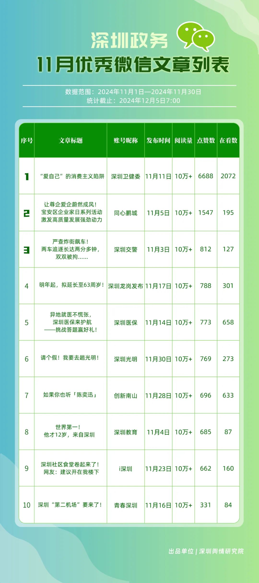 11月,獲“深圳優(yōu)秀政務(wù)微信視頻號”稱號的分別是“深汕視點”“青春深圳”“深圳衛(wèi)健委”“創(chuàng)新南山”“深圳龍崗發(fā)布”“福田融媒”“深圳教育”“深圳天氣”“深圳稅務(wù)”“深圳光明”。其中,“深汕視點”與“青春深圳”通過積極轉(zhuǎn)發(fā)涵蓋廣泛領(lǐng)域的優(yōu)質(zhì)視頻內(nèi)容,贏得了網(wǎng)民的廣泛點贊與推薦,彰顯了其在內(nèi)容聚合與傳播上的獨到之處。“深圳衛(wèi)健委”則專注于衛(wèi)生健康領(lǐng)域,發(fā)布了一系列高質(zhì)量的內(nèi)容,深受網(wǎng)民喜愛,進(jìn)一步鞏固了其在健康傳播領(lǐng)域的領(lǐng)先地位。