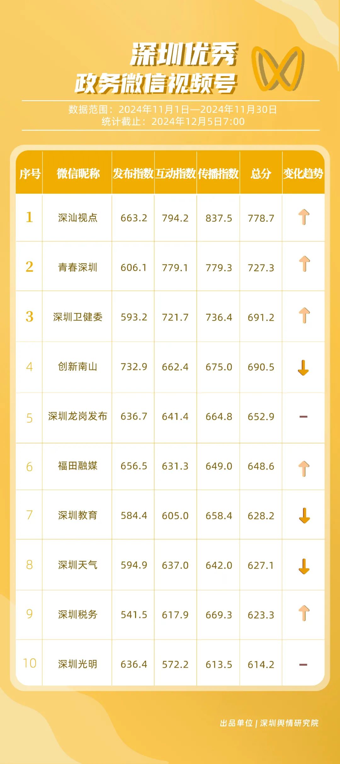 《深圳優(yōu)秀政務(wù)新媒體矩陣》將深圳黨政機(jī)關(guān)、企事業(yè)單位開設(shè)的政務(wù)公眾號(微信)、微博號、抖音號、視頻號(微信)及頭條號按照發(fā)布指數(shù)、互動指數(shù)、傳播指數(shù)三項指標(biāo)進(jìn)行綜合評價,最終形成優(yōu)秀名單。