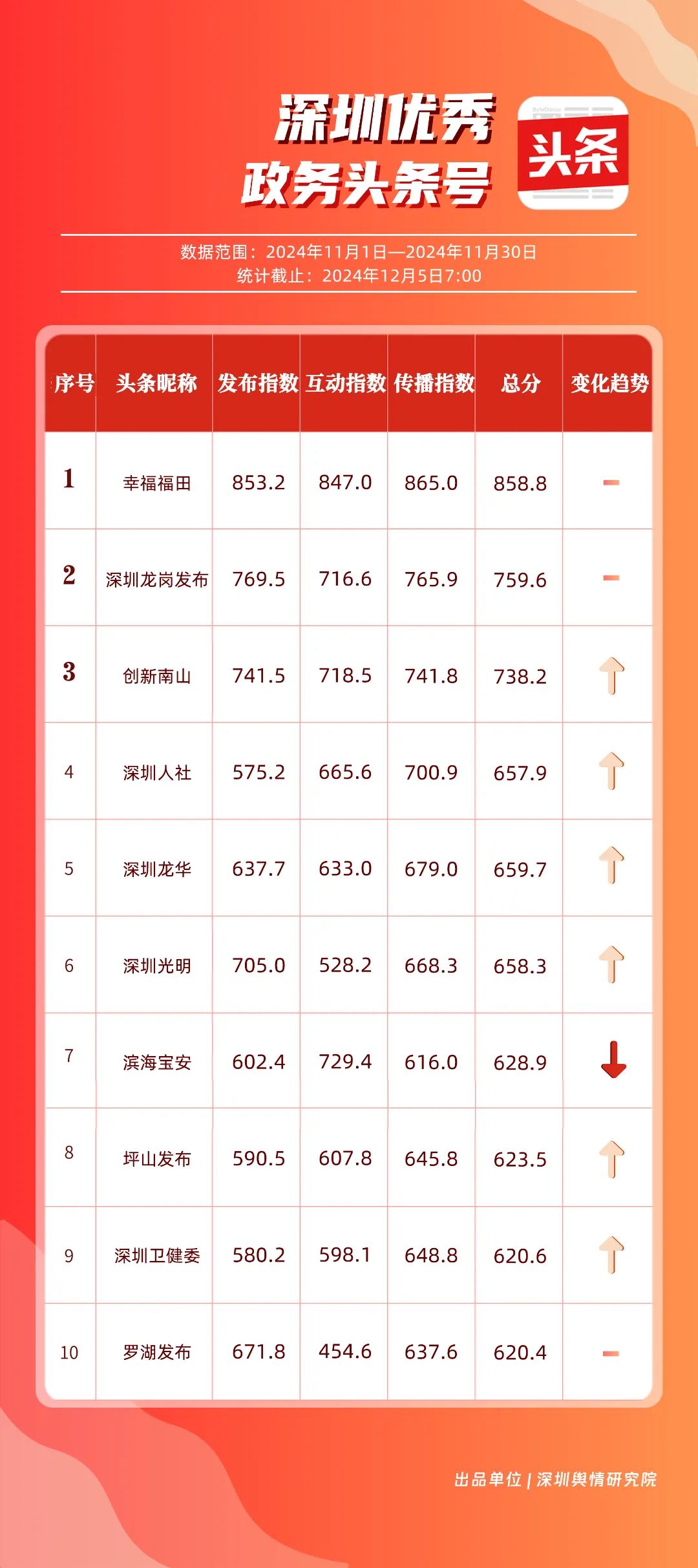 11月,“幸福福田”“深圳龍崗發(fā)布”“創(chuàng)新南山”“深圳人社”“深圳龍華”“深圳光明”“濱海寶安”“坪山發(fā)布”“深圳衛(wèi)健委”“羅湖發(fā)布”共10個政務(wù)頭條號入選“優(yōu)秀政務(wù)頭條號”榜單。“幸福福田”發(fā)布大量民生相關(guān)信息,穩(wěn)居第一?!吧钲邶垗彴l(fā)布”同樣表現(xiàn)不凡,排名始終位于前列,展現(xiàn)了其在信息傳播與政務(wù)服務(wù)方面的卓越能力。此外,賬號“創(chuàng)新南山”“深圳人社”“深圳龍華”“深圳光明”在榜單中的排名有所提升,為政務(wù)新媒體樹立了典范。