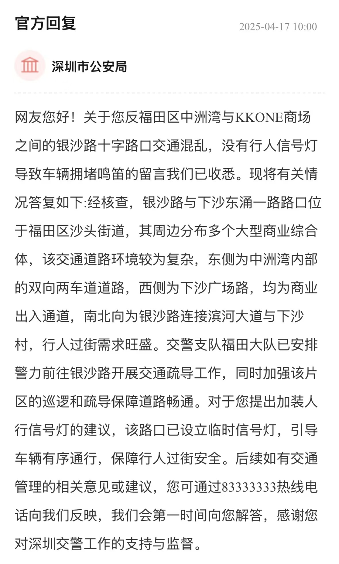 案例點評:商圈周邊商業(yè)密集、道路結(jié)構(gòu)復(fù)雜,面對市民反映問題,市公安局交通警察局一方面安排警力現(xiàn)場疏導(dǎo),另一方面根據(jù)實際情況,設(shè)立臨時信號燈,引導(dǎo)行人安全過街,車輛有序通行。雖未立即加裝固定信號燈,但該局以“應(yīng)急處置、靈活調(diào)整”的務(wù)實方式解決燃眉之急,此類快速響應(yīng)與因地制宜的處置模式,為商圈復(fù)雜路口交通管理提供范本。