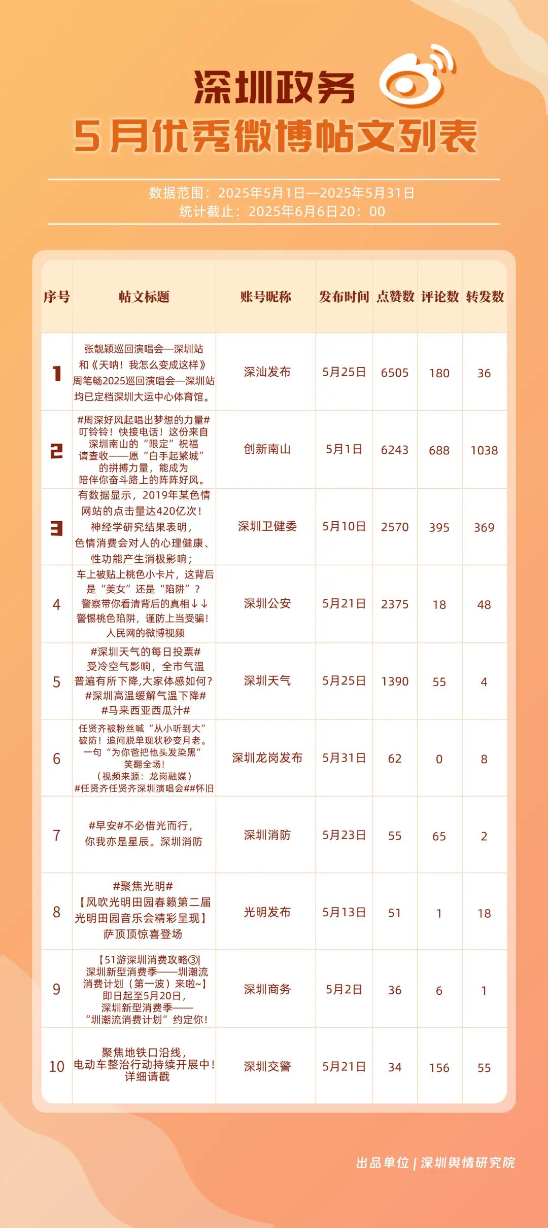 5月,“深圳天氣”“創(chuàng)新南山”“深圳衛(wèi)健委”“深圳消防”“深圳應急管理”“深汕發(fā)布”“深圳公安”“深圳龍崗發(fā)布”“深圳交警”“福田發(fā)布”等20個賬號入選“優(yōu)秀政務微博號”。其中,“深圳天氣”憑借活躍指數(shù)和互動指數(shù)雙項滿分的亮眼成績,穩(wěn)居榜單首位?!皠?chuàng)新南山”以95.96分緊隨其后,在互動、傳播指數(shù)得分大幅提升,排名實現(xiàn)顯著躍升。“深圳衛(wèi)健委”“深圳消防”“深圳應急管理”也表現(xiàn)卓越,總分均超過90分,它們憑借權(quán)威信息發(fā)布、專業(yè)知識科普,展現(xiàn)了各單位在民生服務、公共安全領域的重要作用。以上優(yōu)秀政務微博號深度契合平臺的傳播特征,善于借助熱門話題擴大影響力,以鮮明的賬號特色展現(xiàn)區(qū)域風采。