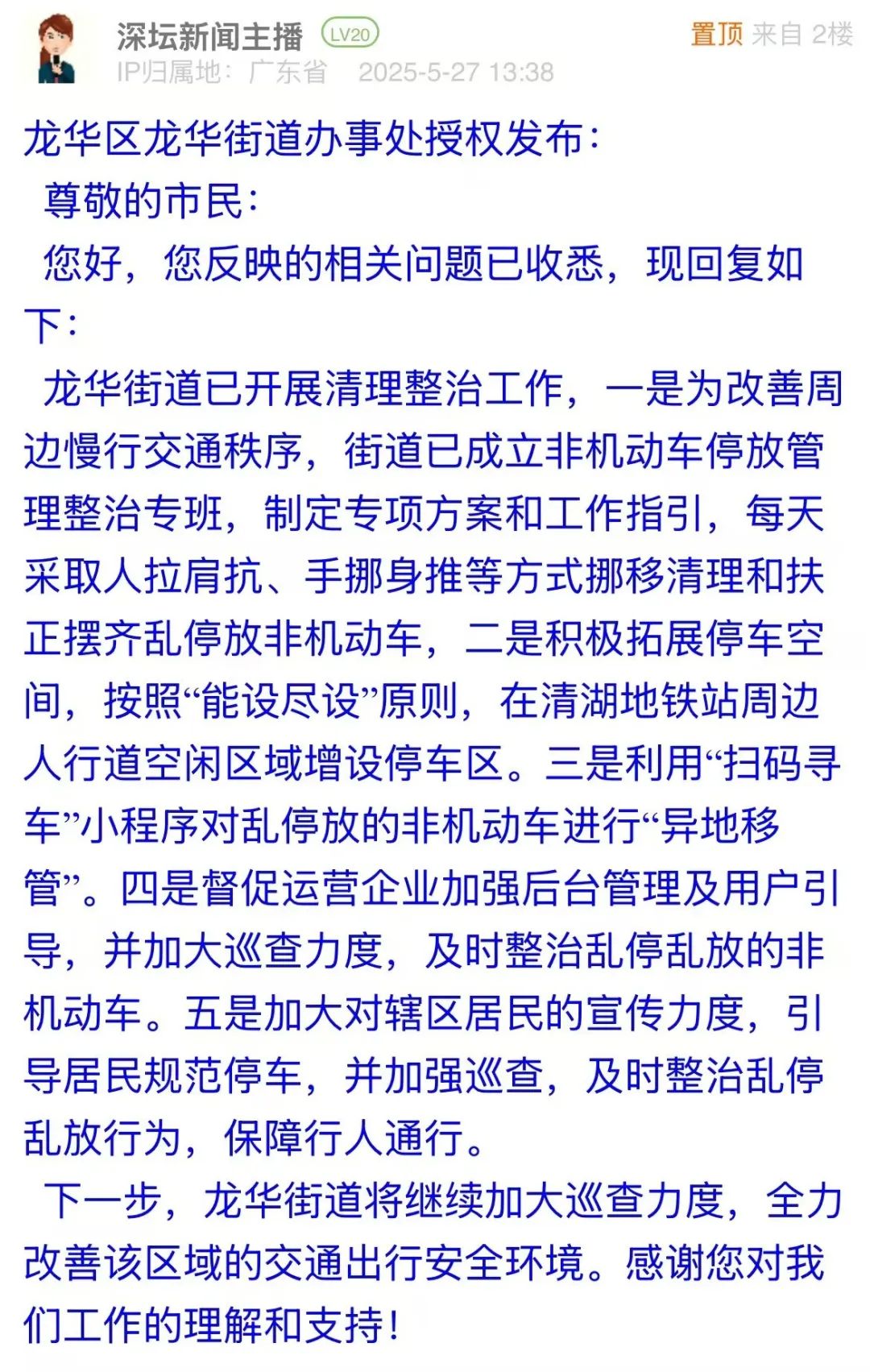 案例點(diǎn)評(píng):地鐵口電動(dòng)車與共享單車堆積,既阻礙行人通行,更影響區(qū)域交通秩序與城市形象。龍華街道辦接訴后迅速響應(yīng),成立專項(xiàng)整治專班,通過每日清理扶正、增設(shè)停車區(qū)、“掃碼尋車”移管、督促企業(yè)巡查及居民宣傳引導(dǎo)等多維度舉措,破解亂停難題,以“疏堵結(jié)合”的治理智慧,快速行動(dòng),綜合施策,為改善區(qū)域交通環(huán)境提供了務(wù)實(shí)范本。