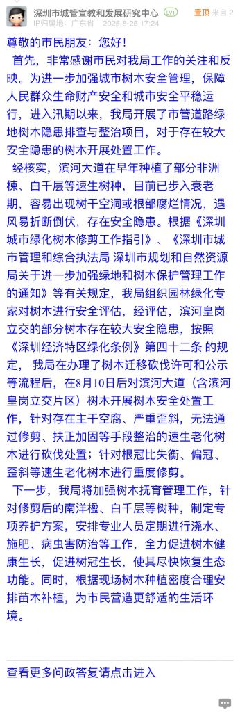 經核實,濱河大道在早年種植了部分非洲楝、白千層等速生樹種,目前已步入衰老期,容易出現(xiàn)樹干空洞或根部腐爛情況,遇風易折斷倒伏,存在安全隱患。根據《深圳城市綠化樹木修剪工作指引》、《深圳市城市管理和綜合執(zhí)法局 深圳市規(guī)劃和自然資源局關于進一步加強綠地和樹木保護管理工作的通知》等有關規(guī)定,我局組織園林綠化專家對樹木進行安全評估,經評估,濱河皇崗立交的部分樹木存在較大安全隱患,按照《深圳經濟特區(qū)綠化條例》第四十二條 的規(guī)定, 我局在辦理了樹木遷移砍伐許可和公示等流程后,在8月10日后對濱河大道(含濱河皇崗立交片區(qū))樹木開展樹木安全處置工作,針對存在主干空腐、嚴重歪斜,無法通過修剪、扶正加固等手段整治的速生老化樹木進行砍伐處置;針對根冠比失衡、偏冠、歪斜等速生老化樹木進行重度修剪。