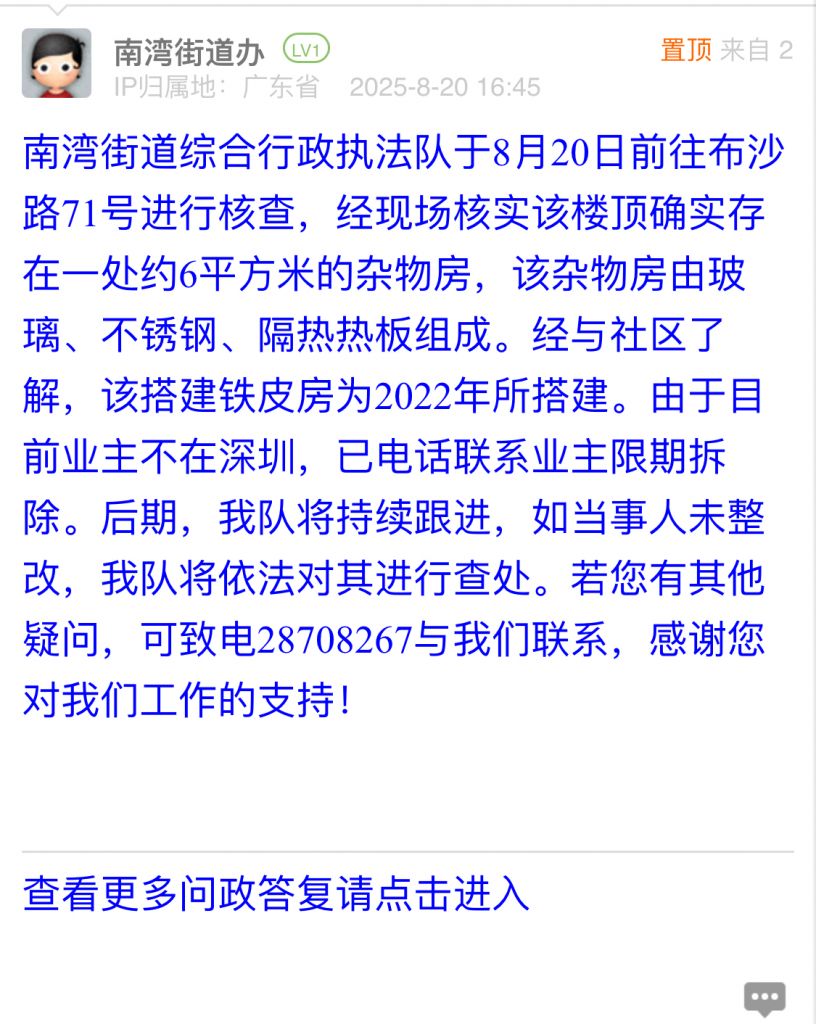 南灣街道綜合行政執(zhí)法隊于8月20日前往布沙路71號進行核查,經現(xiàn)場核實該樓頂確實存在一處約6平方米的雜物房,該雜物房由玻璃、不銹鋼、隔熱熱板組成。經與社區(qū)了解,該搭建鐵皮房為2022年所搭建。由于目前業(yè)主不在深圳,已電話聯(lián)系業(yè)主限期拆除。后期,我隊將持續(xù)跟進,如當事人未整改,我隊將依法對其進行查處。若您有其他疑問,可致電28708267與我們聯(lián)系,感謝您對我們工作的支持!