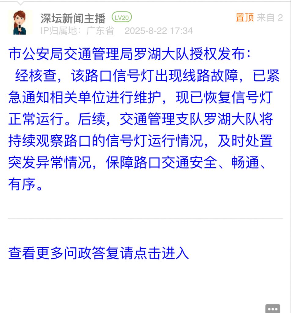 經核查,該路口信號燈出現(xiàn)線路故障,已緊急通知相關單位進行維護,現(xiàn)已恢復信號燈正常運行。后續(xù),交通管理支隊羅湖大隊將持續(xù)觀察路口的信號燈運行情況,及時處置突發(fā)異常情況,保障路口交通安全、暢通、有序。