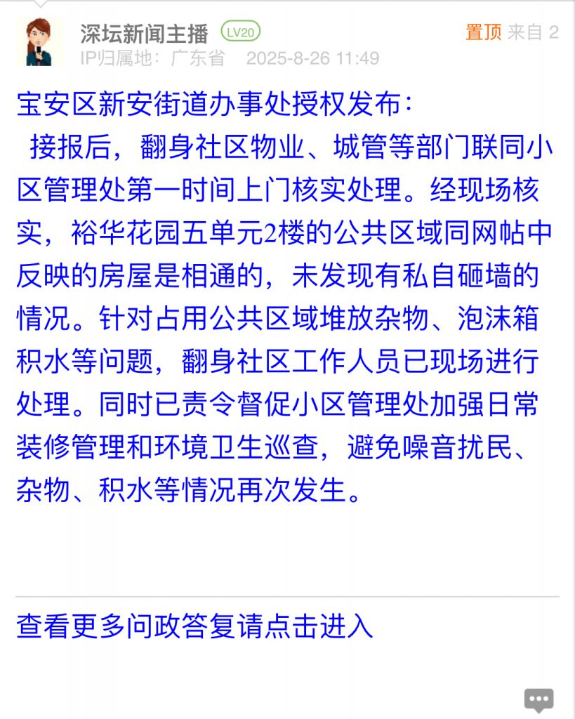 接報后,翻身社區(qū)物業(yè)、城管等部門聯(lián)同小區(qū)管理處第一時間上門核實處理。經現(xiàn)場核實,裕華花園五單元2樓的公共區(qū)域同網帖中反映的房屋是相通的,未發(fā)現(xiàn)有私自砸墻的情況。針對占用公共區(qū)域堆放雜物、泡沫箱積水等問題,翻身社區(qū)工作人員已現(xiàn)場進行處理。同時已責令督促小區(qū)管理處加強日常裝修管理和環(huán)境衛(wèi)生巡查,避免噪音擾民、雜物、積水等情況再次發(fā)生。