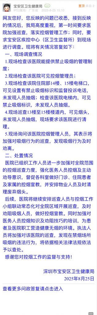 網友您好,您反映的問題已收悉,接到反映的情況后,我局高度重視,第一時間要求醫(yī)院加強巡查,落實控煙管理工作;同時,要求寶安區(qū)疾控中心(區(qū)衛(wèi)生監(jiān)督所)到現(xiàn)場進行調查?,F(xiàn)將有關情況答復如下: