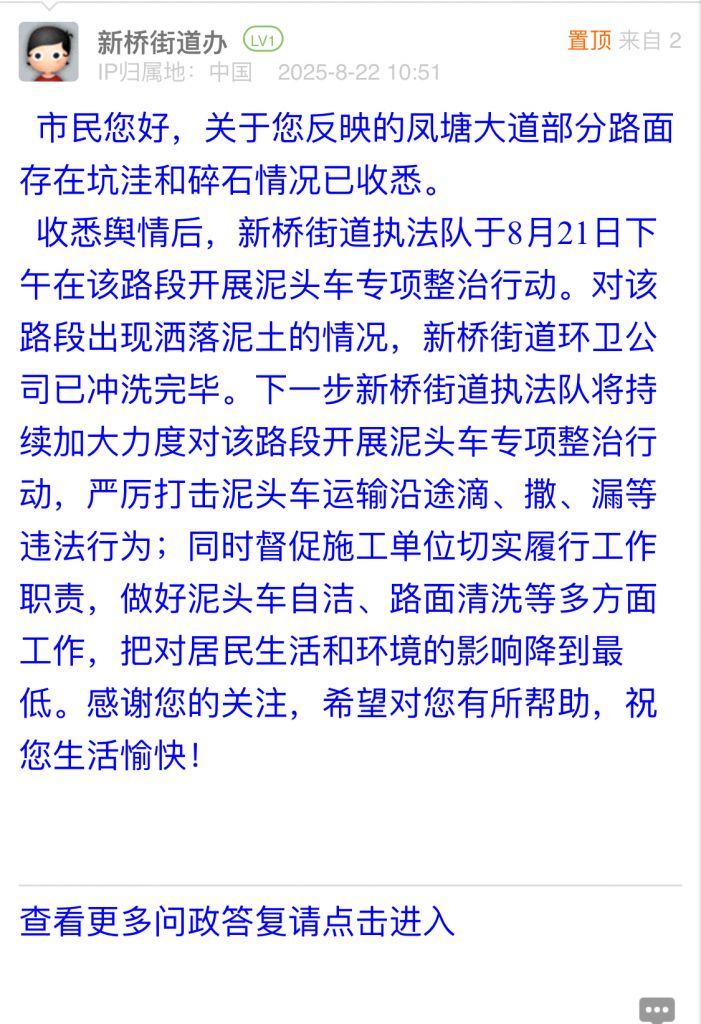 收悉輿情后,新橋街道執(zhí)法隊于8月21日下午在該路段開展泥頭車專項整治行動。對該路段出現(xiàn)灑落泥土的情況,新橋街道環(huán)衛(wèi)公司已沖洗完畢。下一步新橋街道執(zhí)法隊將持續(xù)加大力度對該路段開展泥頭車專項整治行動,嚴厲打擊泥頭車運輸沿途滴、撒、漏等違法行為;同時督促施工單位切實履行工作職責,做好泥頭車自潔、路面清洗等多方面工作,把對居民生活和環(huán)境的影響降到最低。感謝您的關注,希望對您有所幫助,祝您生活愉快!