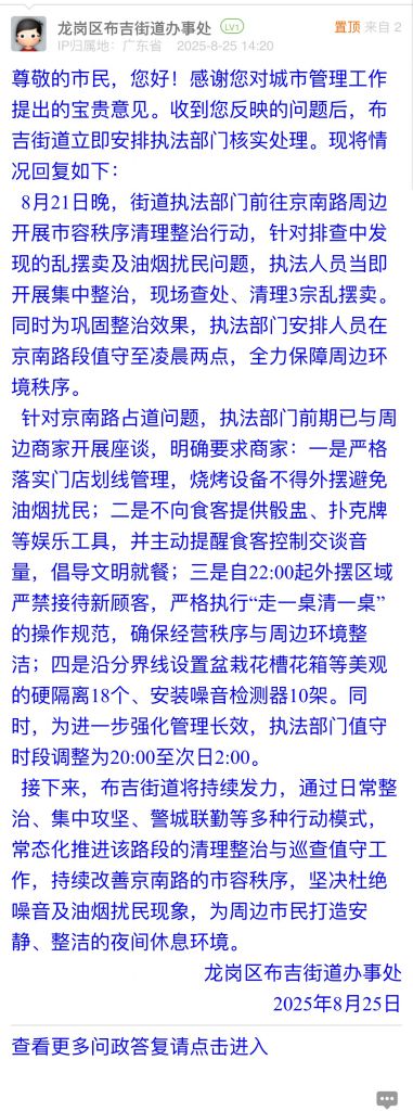 接下來,布吉街道將持續(xù)發(fā)力,通過日常整治、集中攻堅、警城聯(lián)勤等多種行動模式,常態(tài)化推進該路段的清理整治與巡查值守工作,持續(xù)改善京南路的市容秩序,堅決杜絕噪音及油煙擾民現(xiàn)象,為周邊市民打造安靜、整潔的夜間休息環(huán)境。