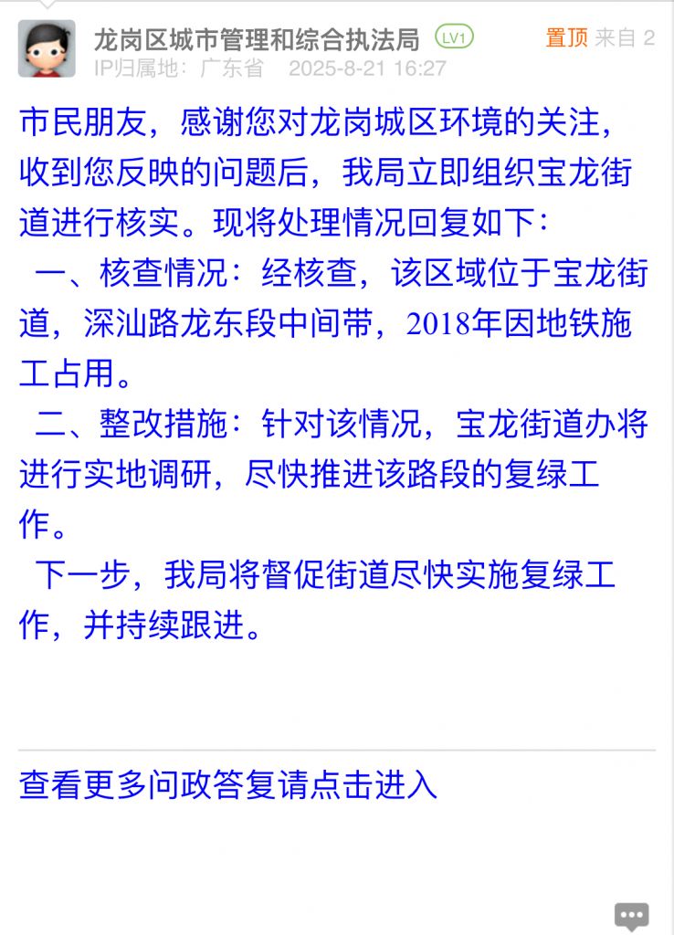 二、整改措施:針對該情況,寶龍街道辦將進行實地調研,盡快推進該路段的復綠工作。