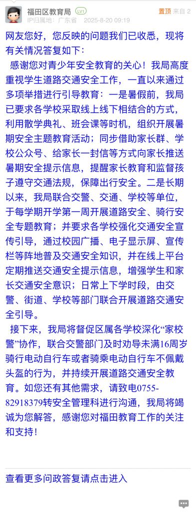 接下來,我局將督促區(qū)屬各學校深化“家校警”協(xié)作,聯(lián)合交警部門及時勸導未滿16周歲騎行電動自行車或者騎乘電動自行車不佩戴頭盔的行為,并持續(xù)開展道路交通安全教育。如您還有其他需求,請致電0755-82918379轉安全管理科進行溝通,我局將竭誠為您解答,感謝您對福田教育工作的關注和支持!