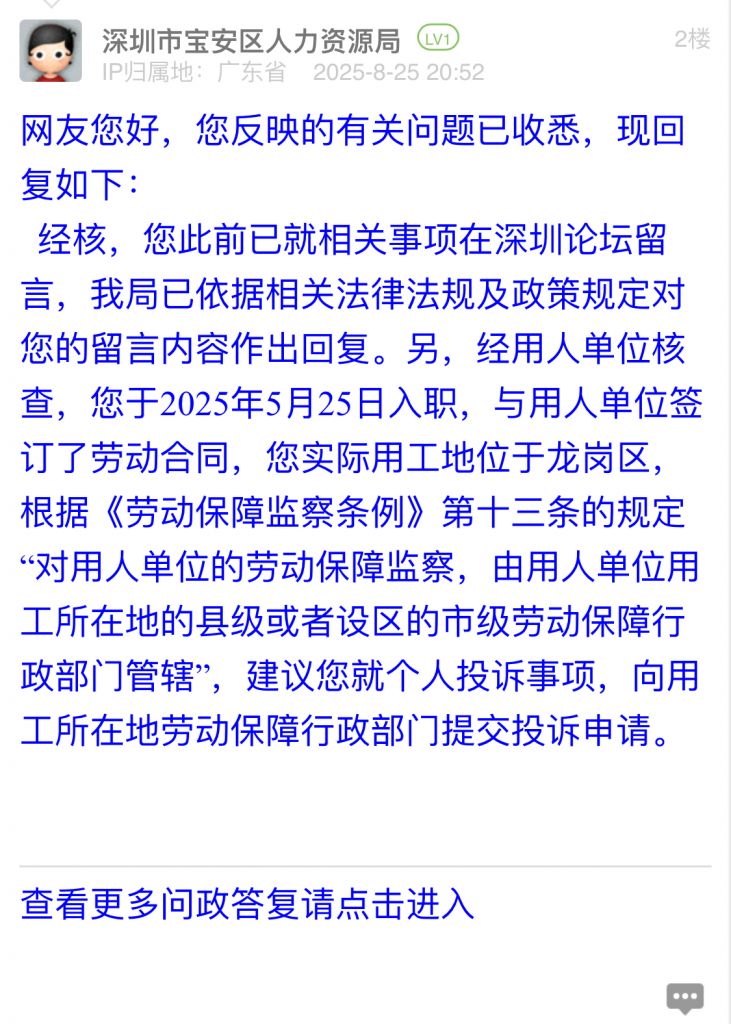 經核,您此前已就相關事項在深圳論壇留言,我局已依據相關法律法規(guī)及政策規(guī)定對您的留言內容作出回復。另,經用人單位核查,您于2025年5月25日入職,與用人單位簽訂了勞動合同,您實際用工地位于龍崗區(qū),根據《勞動保障監(jiān)察條例》第十三條的規(guī)定“對用人單位的勞動保障監(jiān)察,由用人單位用工所在地的縣級或者設區(qū)的市級勞動保障行政部門管轄”,建議您就個人投訴事項,向用工所在地勞動保障行政部門提交投訴申請。