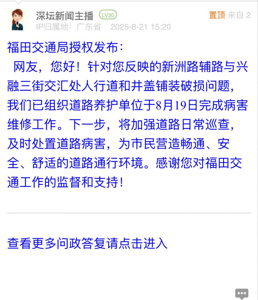 網友,您好!針對您反映的新洲路輔路與興融三街交匯處人行道和井蓋鋪裝破損問題,我們已組織道路養(yǎng)護單位于8月19日完成病害維修工作。下一步,將加強道路日常巡查,及時處置道路病害,為市民營造暢通、安全、舒適的道路通行環(huán)境。感謝您對福田交通工作的監(jiān)督和支持!