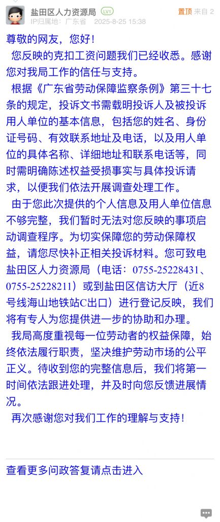 由于您此次提供的個人信息及用人單位信息不夠完整,我們暫時無法對您反映的事項啟動調查程序。為切實保障您的勞動保障權益,請您盡快補正相關投訴材料。您可致電鹽田區(qū)人力資源局(電話:0755-25228431、0755-25228211)或到鹽田區(qū)信訪大廳(近8號線海山地鐵站C出口)進行登記反映,我們將有專人為您提供進一步的協(xié)助和辦理。
