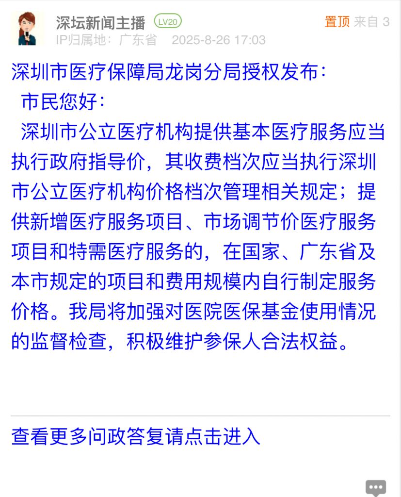 深圳市公立醫(yī)療機構提供基本醫(yī)療服務應當執(zhí)行政府指導價,其收費檔次應當執(zhí)行深圳市公立醫(yī)療機構價格檔次管理相關規(guī)定;提供新增醫(yī)療服務項目、市場調節(jié)價醫(yī)療服務項目和特需醫(yī)療服務的,在國家、廣東省及本市規(guī)定的項目和費用規(guī)模內自行制定服務價格。我局將加強對醫(yī)院醫(yī)保基金使用情況的監(jiān)督檢查,積極維護參保人合法權益。