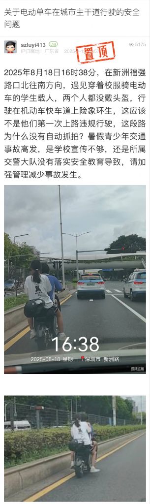 網友您好,關于您反映的新洲路南往北方向電動車違規(guī)駕駛行為的問題福田大隊已收悉并轉轄區(qū)中隊核查,對兩名電動車騎乘人開展批評教育。福田交警在節(jié)假日、開學等時間節(jié)點均開展多次交通安全進校園工作,同步加強護校崗工作,增加護校、護學警力。臨近開學,福田交警將與福田區(qū)教育局共同開展交通安全開學第一課,做好未成年人交通安全保障工作。感謝您對交通工作的理解與支持!